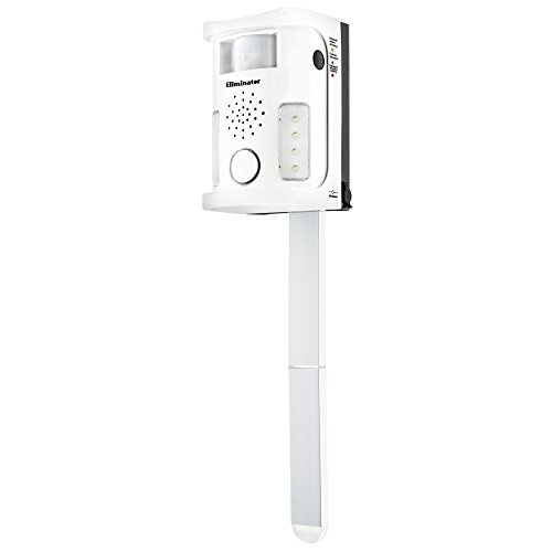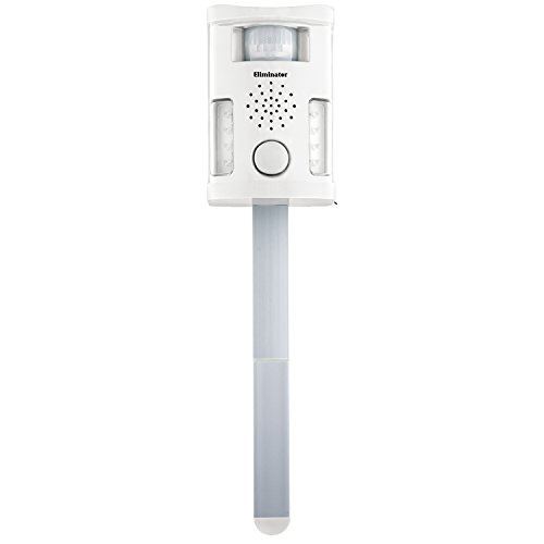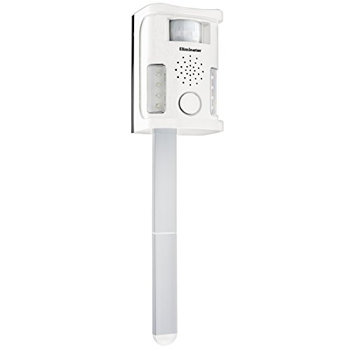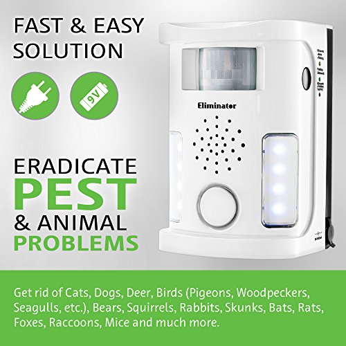 -. Feature : ERADICATE PEST & ANIMAL PROBLEMS -Permanently eliminate pest problems with this powerful ultrasonic/sonic flashing light animal repeller. Select your desired mode of ultrasonic, sonic and strobe flashing. Get rid of Cats, Dogs, Deer, Birds, Bears, Squirrels, Rabbits, Skunks, Bats, Rats, Foxes, Raccoons, Mice and much more. Extremely powerful and will expel even the most aggressive animals from your property. / HUMANE & ENVIRONMENT FRIENDLY - No traps, no dead animals, no messy chemicals or pesticides. Effectively gets rid of all animal and pest through emitting a mixture of ultrasonic, sonic and powerful flashing LED strobe lights, frightening the pests/animals to leave the area. / FAST & EASY SOLUTION - Simply plug in the device and select your desired mode. Adapter is included. Can also be operated with a 9-Volt battery (Not included). / Package includes an aluminum stake for optional sticking into the ground. / HOW IT WORKS - The Eliminator™ Electronic Animal Repeller emits a range of powerful ultrasonic waves, audible sound, and flashing LED strobe lights to scare away a wide variety of outdoor pests. Equipped with an infrared motion sensor; the pest repeller has an optional mode of activating when it senses motion, or it can run continuously. / PERFECT FOR INDOOR & OUTDOOR - Waterproof and can be used for indoors or outdoors. Perfect for yards, patios, basements, garages, attics, porches, boats, gardens, farms, ponds, etc. / COVERAGE AREA: Up to 5000 Sq. Ft. (PIR Motion sensor: Up to 800 Sq. Ft.). Upgraded components and parts for top performance.