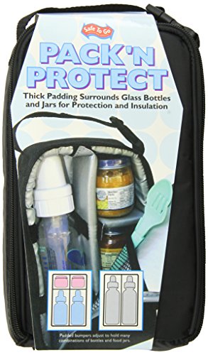 The Pack N Protect Tote surrounds glass bottles and food jars with thick padding for protection and insulation. Padded bumper shelves easily adjust to hold multiple combinations of 4 9 ounce . bottles and food jars. The Pack N Protect is fully insulated and features an interior mesh pocket to hold utensils or an ice pack. The exterior mesh pocket holds bib, wet wipes or pacifiers. Also includes ID card in clear ID card pocket and an adjustable buckle strap to attach to strollers or diaper bags. The Pack N Protect's sleek styling makes it compact to fit in a diaper bag or travel bag. Meets CA Prop 65 and CPSC standards.