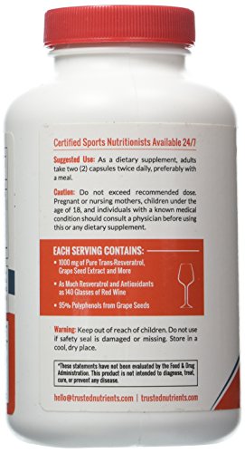 Trusted Nutrients Non-GMO 100% Pure Resveratrol, 1000mg, 180 Veggie Caps: Special Anti-Aging Blend with Trans-Resveratrol, Grape Seed Extract...