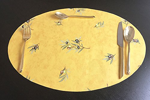 -. Brand : Maison Provence -. Color : Yellow -. IsAdultProduct : 0 -. ProductGroup : Guild Product -. ProductTypeName : GUILD_HOME -. Title : Oval Placemats : Indoor-Outdoor Provence Easy Care Coated Water and Stain Resistant Laminated Placemats Olives all over in Gold-