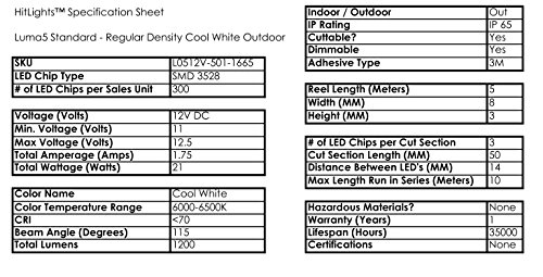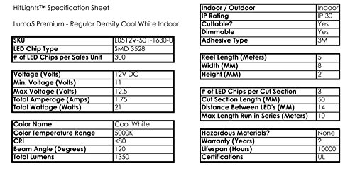 HitLights Warm White LED Light Strip, 3528 - 16.4 Feet, 300 LEDs, 3000K, 72 Lumens per Foot. 12V DC