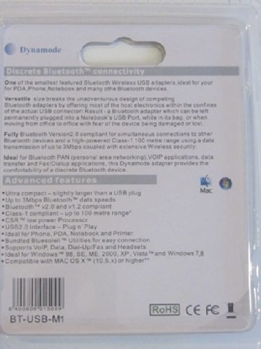 -. Binding : Electronics -. Brand : Dynamode -. EAN : 8400800015099 -. Feature : Ultra compact - slightly larger than a USB plug - Up to 3Mbps BluetoothTM data speeds / BluetoothTM v2.0 and v1.2 compliant - Class-1 compliant - up to 100 metre range / CSRTM low power Processor / USB2.0 Interface - Plug n' Play / Bundled BluesoleilTM Utilities for easy connection - Supports VoIP, Data, Dial-Up/Fax and Headsets -. Label : Dynamode -. Manufacturer : Dynamode -. Model : BT-USB-M1 -. MPN : BT-USB-M1 -. PackageQuantity : 1 -. PartNumber : BT-USB-M1 -. ProductGroup : PC Accessory -. ProductTypeName : COMPUTER_COMPONENT -. Publisher : Dynamode -. Studio : Dynamode -. Title : Dynamode BT-USB-M1 - Ultra Compact Bluetooth 2.0 USB USB Wireless Adapter - Ideal For Windows 98, SE, ME, 2000, XP and Vista Compatible with MAC OS X (10.5.x) or higher - Square Head Type -. UPC : 702565994953