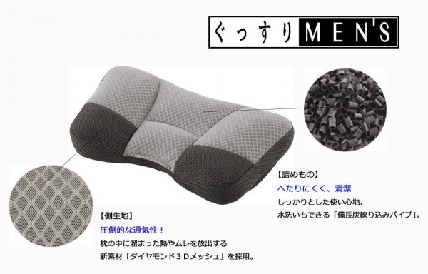 | へたりにくく、しっかりとした備長炭練り込みパイプを詰め物に使用し、頭を支えます。枕裏面には取り出し可能なデオドラントシートが装着されているため、気になる加齢臭や汗のニオイをしっかり吸着・消臭します。 |