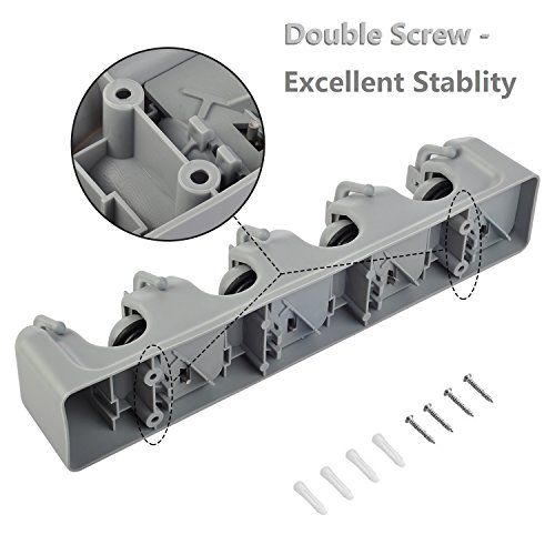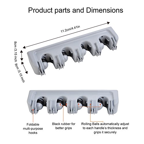 - Easy to Assenmble and Use: This wall mount organizer is mouneted easily, 4 screws and 4 anchors ensure that it will be strong enough. Hold the handles of mops and lift them up then into slots, the rolling ball will adjust itself to different diameters of handles and grip them securely.