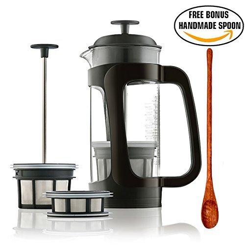 -. Feature : THICK & DURABLE GLASS: The thick, durable Schott-Duran glass of the Espro P3 is a safe way to enjoy French Press Coffee. The glass walls allow you to watch the magic of the brewing process, and the carafe is 40 percent thicker than the typical glass of a French Press Coffee maker. Your coffee will stay hotter longer with the heavy glass carafe. The P3 allows you an economical way to enjoy Espro quality. / BUNDLE KIT INCLUDES EVERYTHING* YOU NEED TO MAKE THE PERFECT CUP OF COFFEE (*except the coffee): Espro Press P3 Glass French Press Coffee Maker (18 oz, makes about 2 mugs US or 4 EU cups), Coffee Filter (double-microfilters with twist-lock for easy separation), 25-unit starter-pack of paper-filters, 8.5" long handmade wooden stirring coffee spoon. / 3 FILTER CHOICES for PERFECT COFFEE or TEA: The Espro provides three filter options for the brewing connoiseur. You can choose the standard double French press filter for your coffee, the tea filter, or you can add the optional paper filter to the brewing basket providing the cleanest cup of coffee or tea. With brew flexibility of the P3, you can create classic French press coffee, cold brew coffee, or drip-style coffee using paper filters. / GRIT-FREE COFFEE GUARANTEED: The dual micro filters of the Espro P3 cut down significantly on the coffee sediment that remains in your hot drink. These mesh filters snap safely together and are made of super-fine mesh that will give you all of the flavor and none of the grit. The main difference between the P3 and the other models is the sleek plastic caging encasing the glass carafe. / FREE BONUS (Beautiful 8.5" long handmade wooden stirring spoon): The Espro Press P5 also makes a great gift that keeps on giving. Included with your purchase of this French Press Coffee Maker is the perfect, free accompaniment--a beautifully crafted wooden spoon.