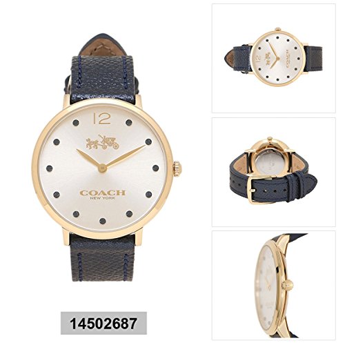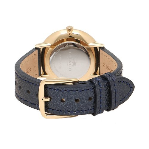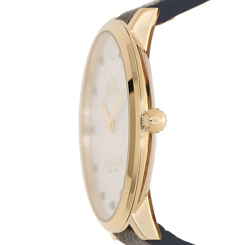 Metallic leather meets the warm tone of gold-washed hardware on this understated everyday watch. Bordered with Swarovski® markers, the brilliant silver-white face with plated metal Horse and Carriage logo brightens the look of this timepiece.