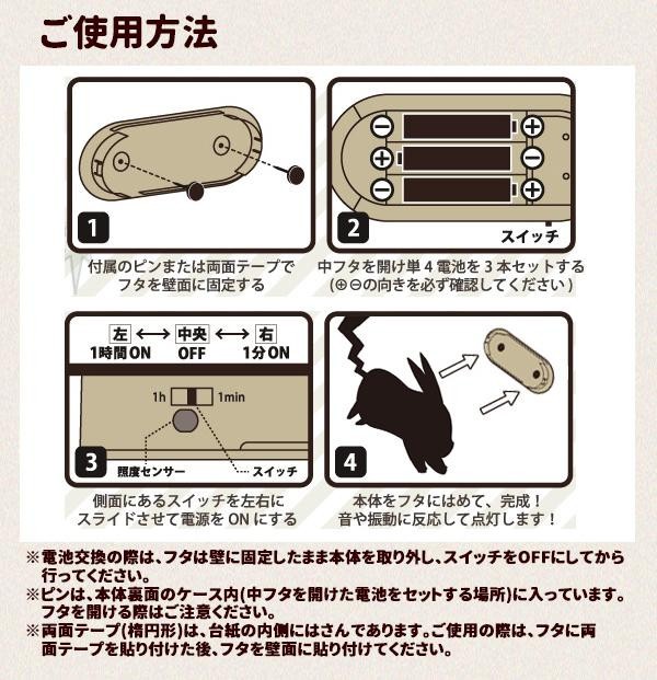 | 仕様 | ●使用電源:単4電池×3本(別売り) ●電池寿命目安:約2000回点灯(1分間点灯、アルカリ電池使用時) ※使用状況・環境により異なる。 ●音や振動に反応して点灯(1分または1時間で自動消灯) ●照度センサー機能付 ●取扱説明書(台紙裏記載) |