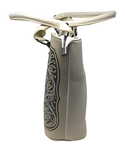 This partial genuine leather has the front panel which is genuine leather tooled with a vintage floral look. Back of purse has vertical zipper to hold concealed weapon. Top zips closed for safety and containment, and inside of bag has a central zippered compartment.