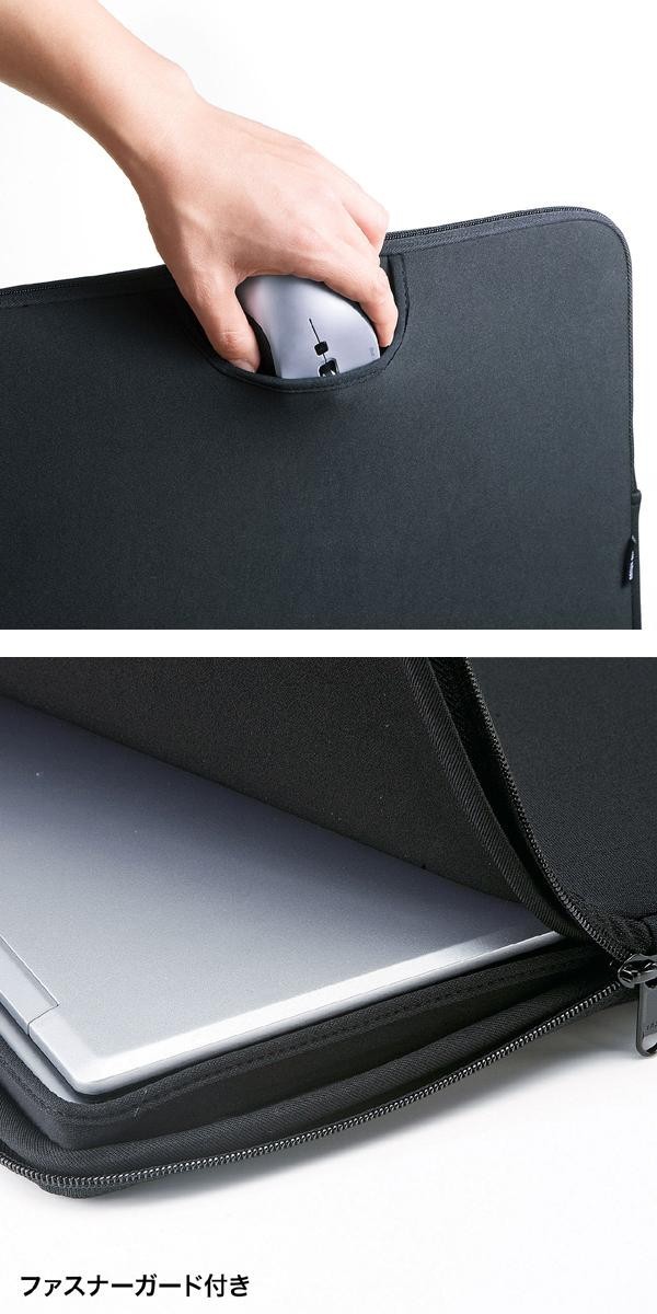 | 保護力・耐久性に優れたウェットスーツ生地のインナーケースです。フロントポケットには、アダプタやマウスなどが簡単に収納できます。内部には、ファスナーとパソコンが接触するのを防ぐファスナーガード付きです! |