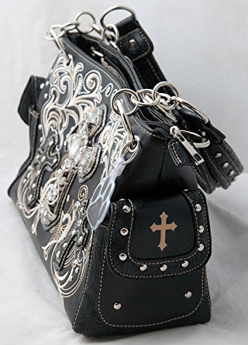Made from high quality premium black faux/imitation leather with large silvertone rhinestone cross accented with cut-out crosses next to it, embroidered scroll designs, rhinestones, silvertone hardware, and detachable HW Collection key ring/purse charm on the front