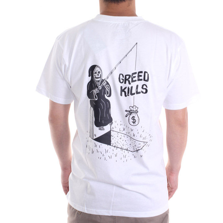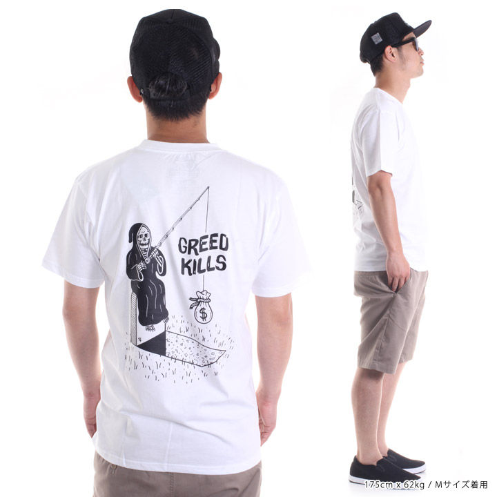 メッセージ性の強い"GREED KILLS=欲望を殺す"に皮肉が込められたどこか憎めないイラストのTシャツ。コットン100%のボディにしっかりとした首周りで抜群の着心地◎ピスネームのアクセントもポイントに。ストリートでも目立つこと間違いなしの一枚です。