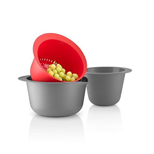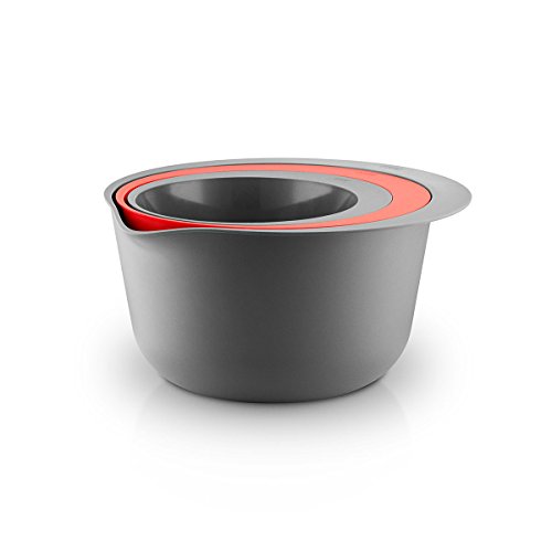 - The set comprises a whisking bowl, a colander and a large mixing bowl with a pouring lip.