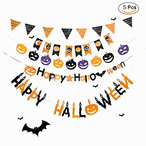 - 5 in 1 BANNER PACKAGE - Package:2* Pumpkin banner(8 pcs sets) + 1*Triangular Flag(8 pcs sets) + 2*Pull Flag String (Happy Halloween)