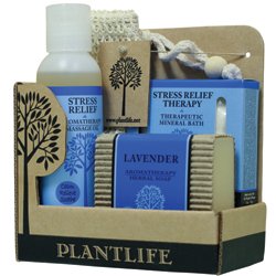 Our Stress Relief Spa-Therapy kit contains a 4 oz. bar of Lavender Aromatherapy Herbal Soap, 4 oz. Stress Relief Aromatherapy Massage Oil, 3 oz. Stress Relief Therapeutic Mineral Bath Salt and an Exfoliating Ramie Soap Sack. Everything you need to unwind- a great way to treat yourself after work!Feature