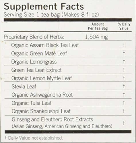 -. Feature : Pack of 3, 1.02 ounce / Designed to help energize and elevate your mood. / Made with 71% organic ingredients, all natural with no preservatives or artificial ingredients / Brews an elegant, balanced and fully flavored cup of tea / Each tea bag contains approximately 80 mg of caffeine, as compared to approximately 90 mg in 8 oz of coffee