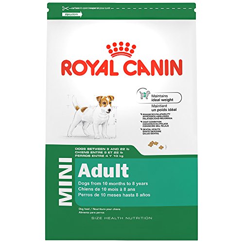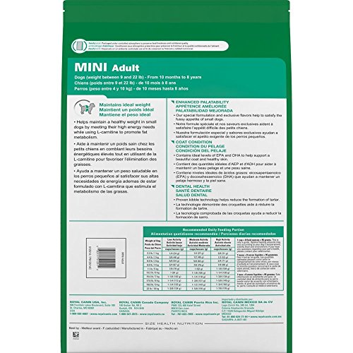 Royal Canin MINI Adult provides suitable nutritional supply in carefully adapted amounts to help active and playful dogs stay fit. This diet includes sodium tripolyphosphate and specialized kibbles help reduce dental plaque and limit tartar formation. MINI Adult contains balanced protein and fat levels provide optimal energy to maintain a healthy adult weight. This diet features a flavor combination that satisfies even the most demanding palate. MINI Adult also contains essential fatty acids, amino acids and vitamins combine to protect the coat. Recommended for small breed dogs weighing up to 20 pounds at adulthood, from 10 months to 8 years of age. Size: 14 pounds.Feature