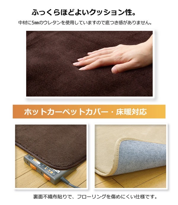 表地にはフランネルと呼ばれる、しっとりとして非常にやわらかい生地を使用しています。電気カーペットカバーとしても使用できます。フローリングを傷つけにくいよう裏には不織布を貼っています。