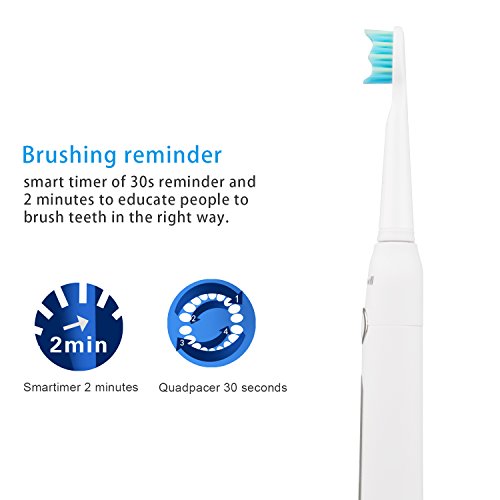 2 minutes smart timer with interval pause reminding each 30 seconds. Waterproof electric toothbrush rated IPX5. Low battery reminding. Anti-slip handle.