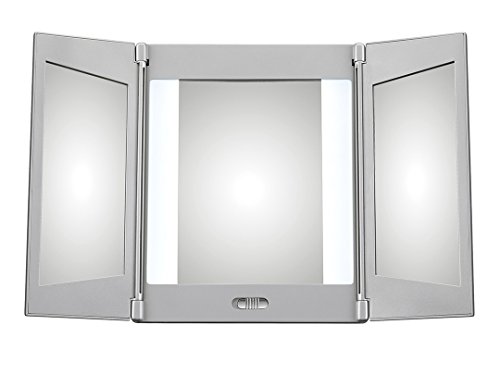 -. Feature : Never have to replace bulb / 70% more energy efficient / 5X center magnification and (2) 1X side panels / Slim profile / Elegant silver finish with chrome accents / Adjustable stand / 5' line cord