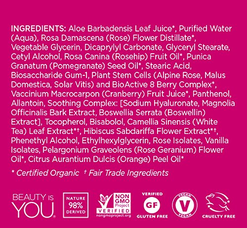 - Pomegranate tones and tightens as hyaluronic acid and aloe Vera revive skin's moisture