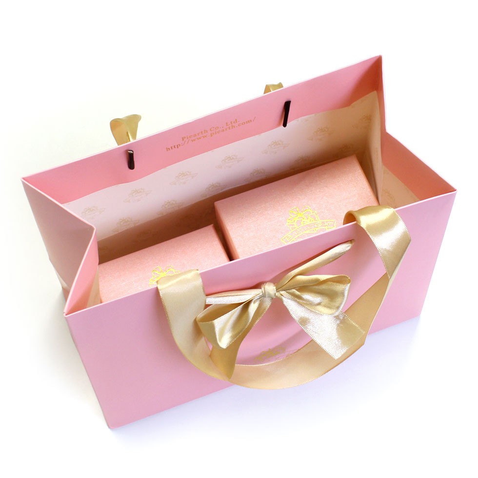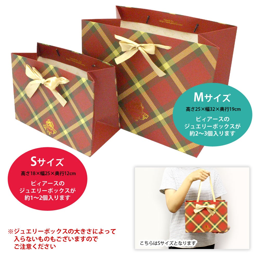 ピィアースロゴが入ったオリジナルギフトバッグです。ピィアースのジュエリーボックスを入れてプレゼントにご使用ください。-----------------------------サイズ:約18×25×12cm素 材:紙、リボン(布)-----------------------------・掲載画像は実物と同じ色合いを再現するようにしておりますが、PC環境等により若干異なる場合がございます。・リボンにシワが付いている場合がございます。整えてからご使用ください。・ジュエリーボックスのサイズによっては入らない場合がございます。・折りたたんた状態でのお届けとなります。届いたら商品を入れ、プレゼントなどにご使用ください。