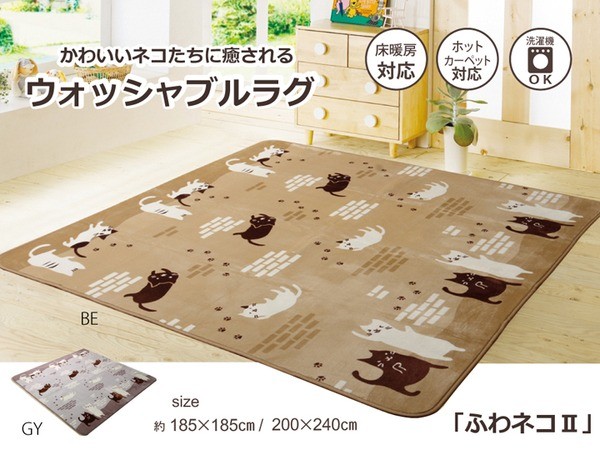 【商品名】なめらかタッチ ネコ柄 ラグマット 絨毯 洗える 『ふわねこ2』 ベージュ 約200×240cm
