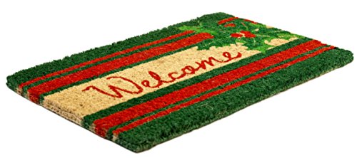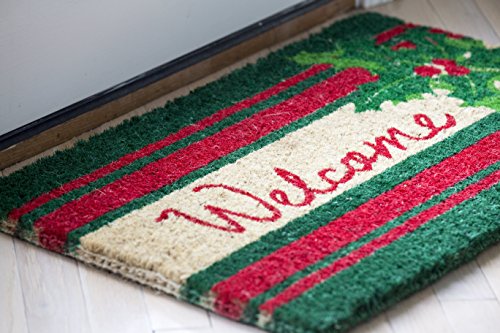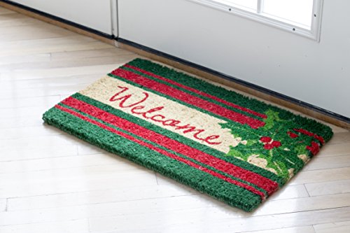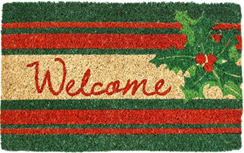 Decorate your entryway with a cherished holiday classic: a universal welcome message and a sprig of holly dotted with bright red berries. The alternating red and green stripes lend both sophistication and holiday cheer to this eye-catching design. Entryways doormats are crafted to the industry’s highest standards. Woven of coir, they are made and painted by hand. They measure 18” x 30” and are 3/4” thick.Greet your visitors with this eye-catching door mat. Handcrafted of 100% all natural coir with fade resistant dyes. Hand-woven by artisans in India - supports a cottage industry. Removes dirt, debris, mud and moisture from your shoes. Because each doormat is handmade of all natural products - sizes and colors will vary slightly. Intended for outdoor use. Best location is under a covered area. Due to the nature of the natural Coir fiber, shedding may occur, but over time this will lessen. Sweep or shake to clean.Feature
