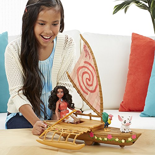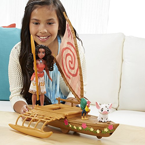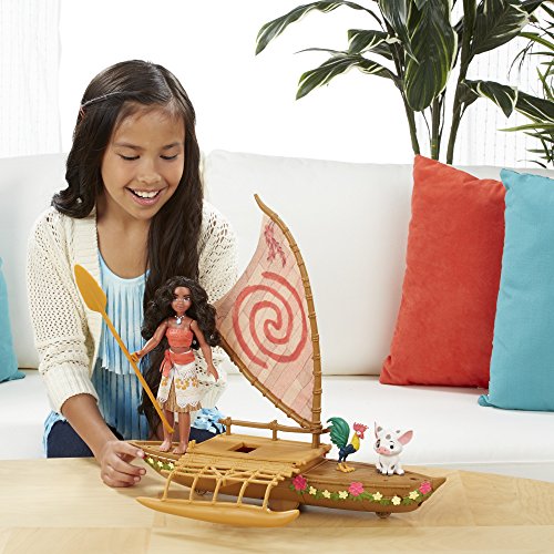Moana of Oceania sets sail to save her people and find the answers she’s been searching for her whole life. Along with the gentle rocking action, this boat projects starlight on the wall or in front of the boat. Kids can imagine joining Moana of Oceania and her friends Pua and Hei Hei on their journey, as the constellations guide their way. Includes boat, oar, doll, 2 figures, and instructions. (Not intended for water play.) Copyright Disney Hasbro and all related terms are trademarks of Hasbro.Feature