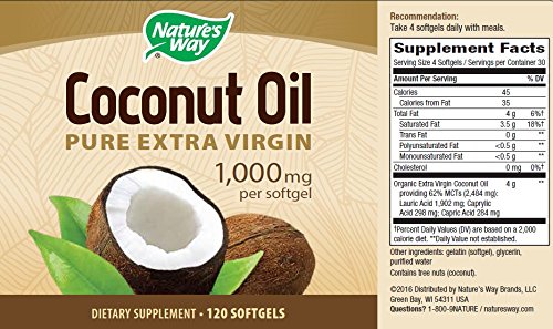 -. Feature : Nature's Way Coconut Oil - 1000 mg - 120 Softgels / Country of Origin:=USA||Dairy Free:=No||Fair Trade:=No||Gluten Free:=Yes||Ingredients:=Serving Size: 4 SoftgelsServings per Container: 30Amount Per Serving % Daily ValueCalories 45 Calories from Fat 35Total Fat 4 g 6