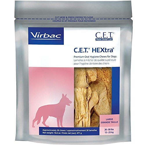 -. Binding : Misc. -. Brand : Virbac -. EAN : 0802695753311 -. Feature : CET HEXtra Premium Chews combine the mechanical action of rawhide, the renowned antimicrobial power of chlorhexidine and the trusted C.E.T. name in a convenient, palatable chew for dogs. / Rawhide chews have been shown to be safe and effective in reducing plaque accumulation. / CET rawhide chews contain a dual-enzyme system that improves their effectiveness compared to plain rawhide chews. / Use C.E.T. Oral Hygiene Chews daily as a first step toward oral hygiene or on those days when brushing isn't possible. / Premium chew clinically proven to reduce calculus when used daily in dog Provides a well-known antiseptic effect and helps remove plaque and reduce tartar. Chews are coated with exclusive 10% solution of chlorhexidine gluconate. Contains beefhide for natural abrasive cleansing action. -. Label : United States -. Manufacturer : United States -. PackageQuantity : 1 -. ProductGroup : Pet Products -. ProductTypeName : PET_SUPPLIES -. Publisher : United States -. Studio : United States -. Title : CET Premium Enzymatic Hextra Oral Hygiene Rawhide Chews for Large 26 - 50 lbs. -. UPC : 802695753311