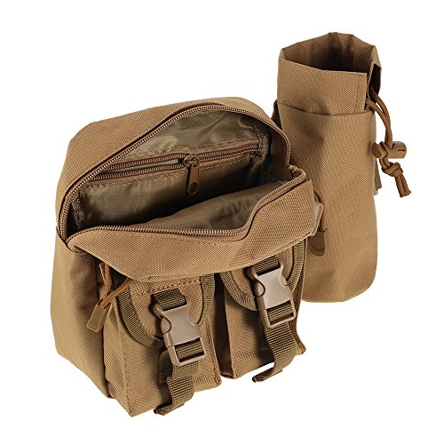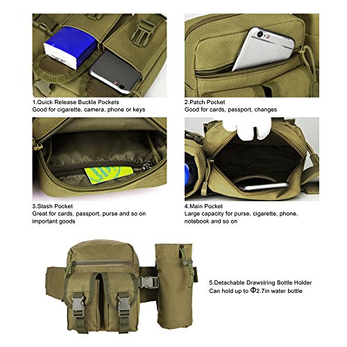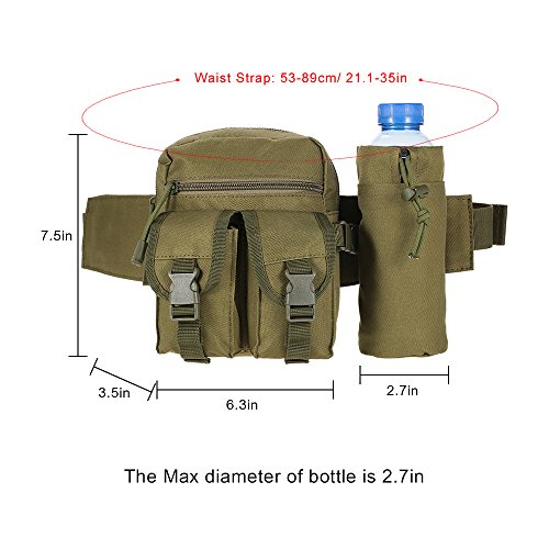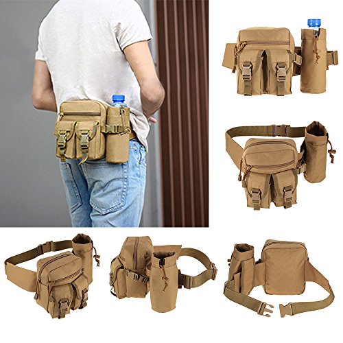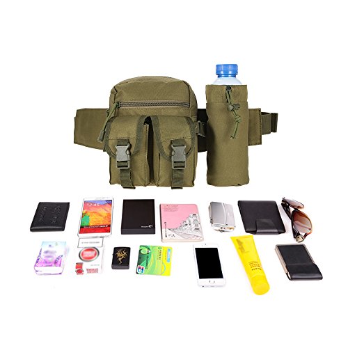 -. Feature : High-density 1000D Nylon fabric and quality ABS buckle, light weight Small and compact, you can carry it anywhere with ease. / Five different size pockets fully meet your basic outdoor needs: The large main compartment is big enough for carrying your glasses, keys, MP3, food, tools, etc. / The zippered front pocket is for extra protection about your passport, ID card, Credit card, wallet and essential stuffs. / The two buckle pocket can be used to hold your phone and cigarette. And one removable bottle holder. / Perfect for jogging, walking, cycling, hiking, hunting, camping, travel, mountain, trekking, outdoor sports, holidays and leisure life.