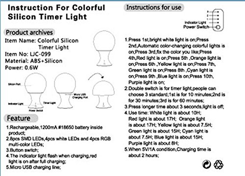 As a Good Gift for Your Family and Friends!? With 3 Year Warranty: 100% SATISFACTION GUARANTEE from XKTTSUEERCRR. Any problem, please feel free to contact us. ? Instructions: 1. Fully charged for first time use, the indicator will keep flashing when charging, and will keep red when done. 2. Press once to turn on the white bright light, again to change into color light mode. Long press the button for 3 seconds. ? Warnings: 1. Before first time use, get it fully charged. 2. Please don't dispose the interior components by yourself in case of any potential damage. 3. Please place this product in a dry environment when not in use for a long time. 4. Children under 6 years old must not play this product alone. ? Features: ★ Shape Transformable ★ 8 Color Light ★ Built-in Timer Function ★ Tender Baby Guardian, Breast Feeding Diaper Changing Helper ★ Well Lighting Creates a Sense of Romance ★ Soft Light Brings You Sweet Dreams ? Widely Used: Baby Room: Creates intimacy and protects your sweet angels Hallway: Welcome home by the warm light Dining Room: Well lighting creates a sense of romance Study Room: High brightness mode give you light for environment work or life Bedroom: Soft night light color will bring you sweet dream bring your sweet dreams and emotional Outdoor: A good companion for outdoor activities ? Specifications: * Dimension: 7.1"x4.7" * Input Voltage: DC5V * Battery: 1200mAh lithium * Charging Time: 2hrs * Power: 0.6W * Material: ABS Silicon * Power Input: USB * Timer Mode: 10, 30 and 60mins ? Package: 1 x Multicolor LED Rechargeable Night Lamp with USB Cable 0 |