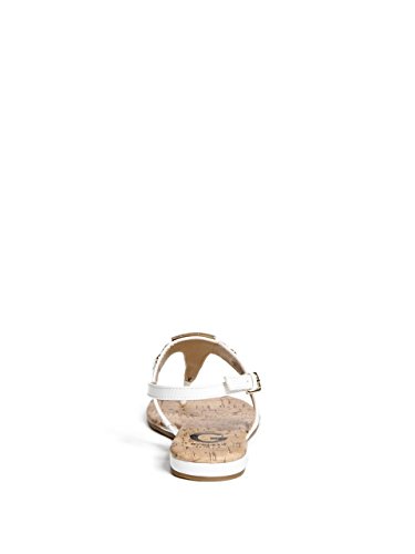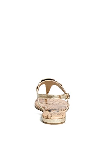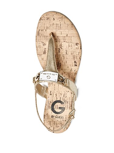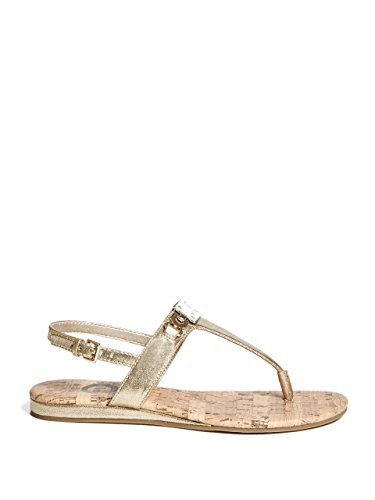 Studio : GByGUESS Publisher : GByGUESS Binding : Apparel Product Description These essential t-strap sandals feature an enamel logo plaque with rhinestones and gold-tone details. Finished with a cork-inspired insole and an adjustable ankle strap with buckle closure. 0