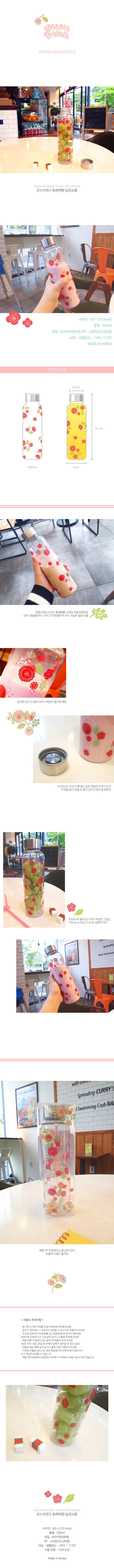 * 문쓰프렌즈 슬림 보틀 - 사이즈 : 60 * 210 (mm) - 재질 : 트라이탄(본체), PP · 스테인리스(뚜껑) - 용량 : 500ml - 내냉.내열온도 : -30℃~110℃ - 원산지 : 대한민국 - 사용연령 : 15세 이상