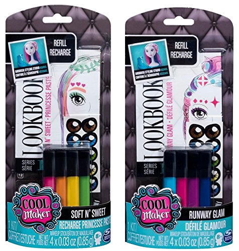 This includes the Soft 'N Sweet Set and the Runway Glam Set. These are designed for use with the Cool Maker Airbrush Styling Studio (sold separately). Each refill set includes 4 colors of makeup sticks (washable markers), 2 Sheets of Hair Stencils, 2 Sheets of Makeup Stencils, 1 Sheet of Eye Color Stickers, 1 Runway Glam Lookbook. Check out the Lookbook for inspiration and style ideas. After you finish styling your model (sold separately), the colors are easy to wash off, and then try another design! The Soft 'N Sweet has 4 pastel hues- pink, orange, yellow, green. The Runway Glam has 4 glamorous colors- turquoise, hot pink, deep purple, indigo. For Kids Ages 8+.Feature