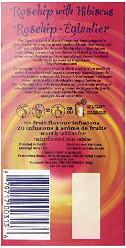 -. Binding : Grocery -. Brand : London Fruit & Herb -. EAN : 0879717003136 -. Feature : Rosehips, hibiscus and rose petals blended together for a refreshingly light tea / Delicious if served hot on a cool day or iced on a hot day / Naturally caffeine free / Kosher certified / Blended in the European Union -. Label : Acme Imports -. Manufacturer : Acme Imports -. MPN : LFHRH -. NumberOfItems : 1 -. PackageQuantity : 1 -. PartNumber : LFHRH -. ProductGroup : Grocery -. ProductTypeName : GROCERY -. PublicationDate : 2012-05-29 -. Publisher : Acme Imports -. Studio : Acme Imports -. Title : London Fruit & Herb Company Tea, Rosehip with Hibiscus, 20 Count -. UPC : 879717003136