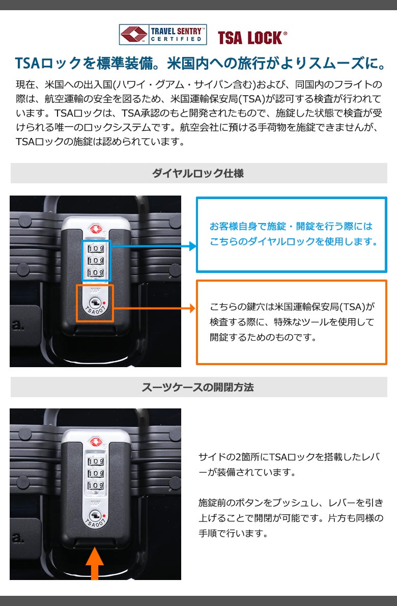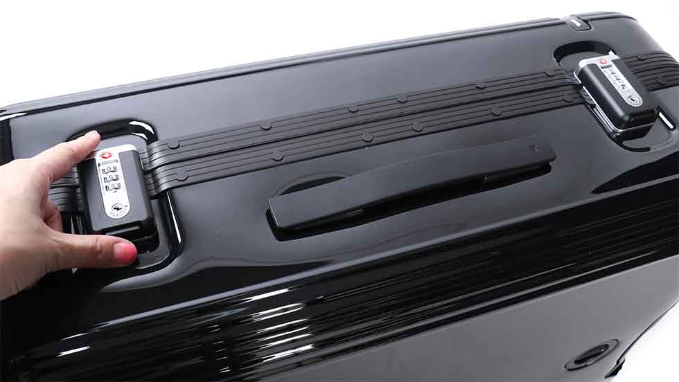 本体サイドに2箇所設けられたダイヤル式TSAロックが特徴的。高い堅牢性を持ちながら、ワンタッチでオープンする扱いやすさも魅力的です。アメリカ国内の空港利用時には欠かせない機能で安心して旅行を楽しむことができます。