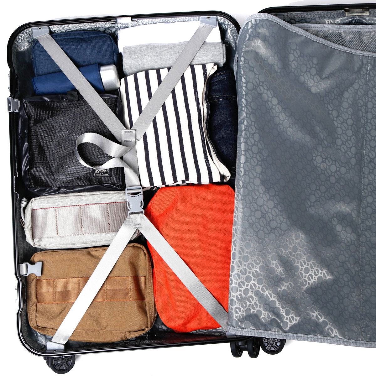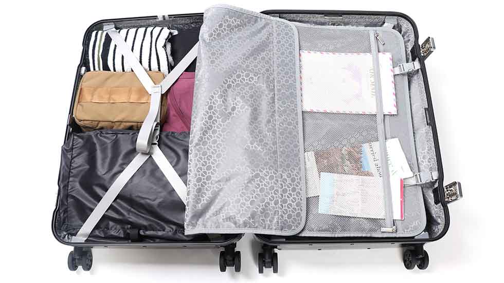 5~6泊程度の旅行や出張に最適なサイズ感。内装は両面に配置された中仕切りとクロスベルトで荷崩れを防ぎます。中仕切りには視認性の高いメッシュジップポケットも設けられており、小物や紙類の管理に便利なつくりになっています。