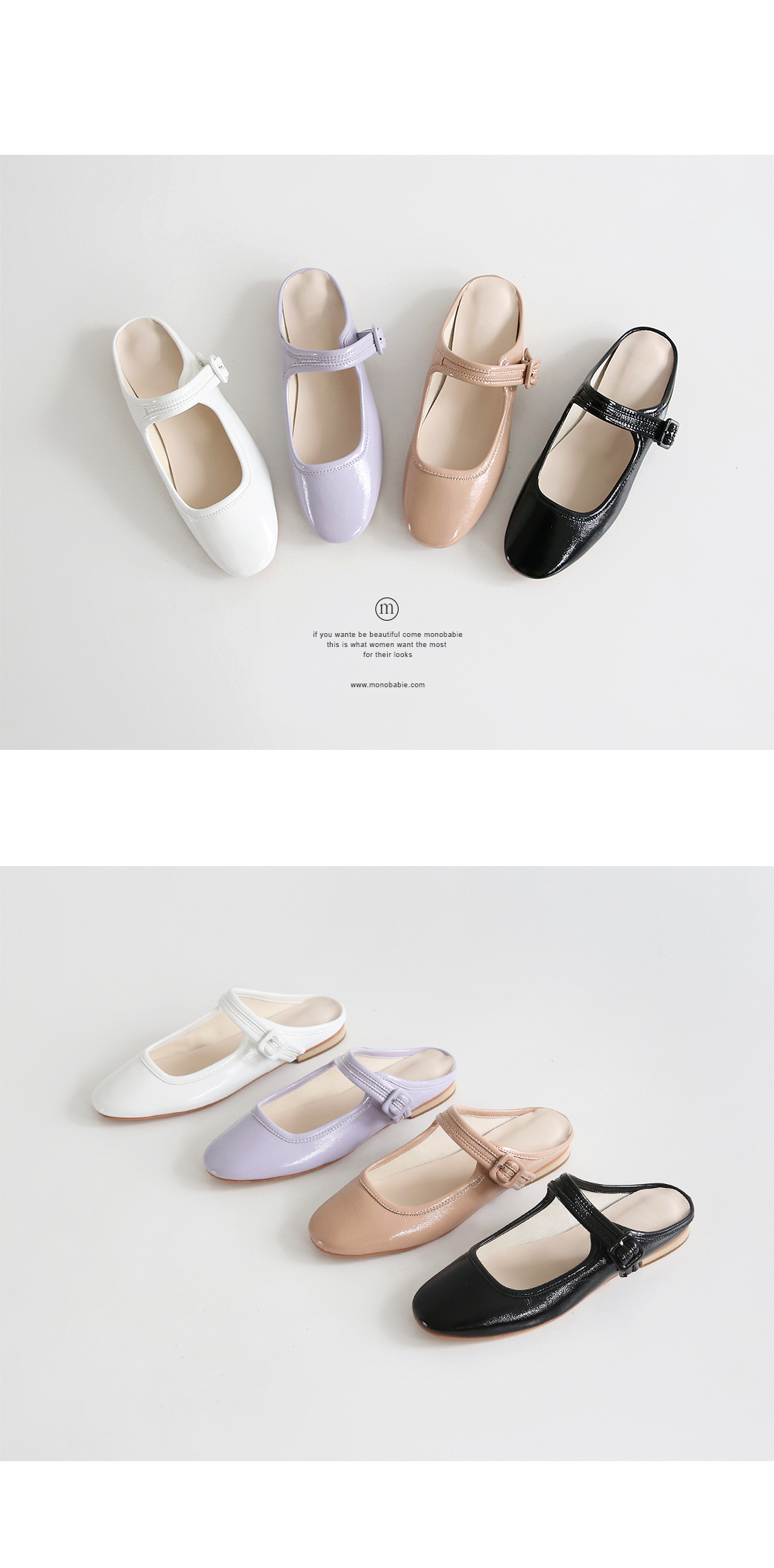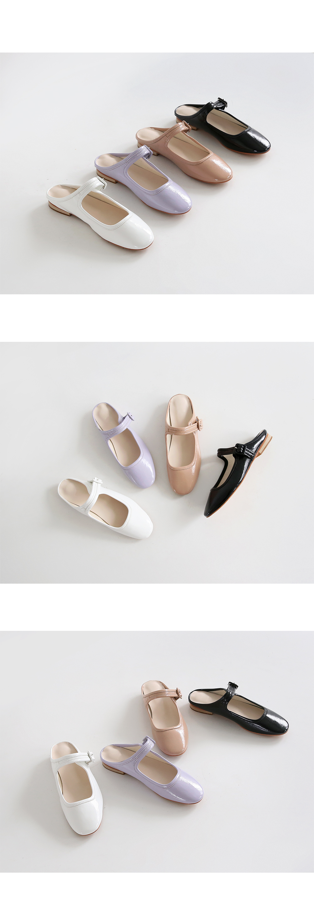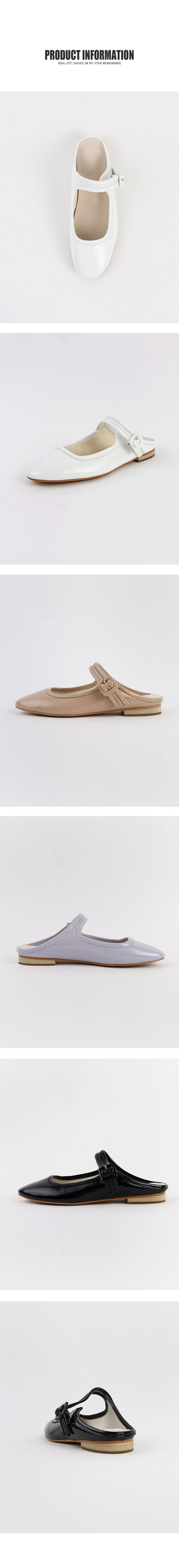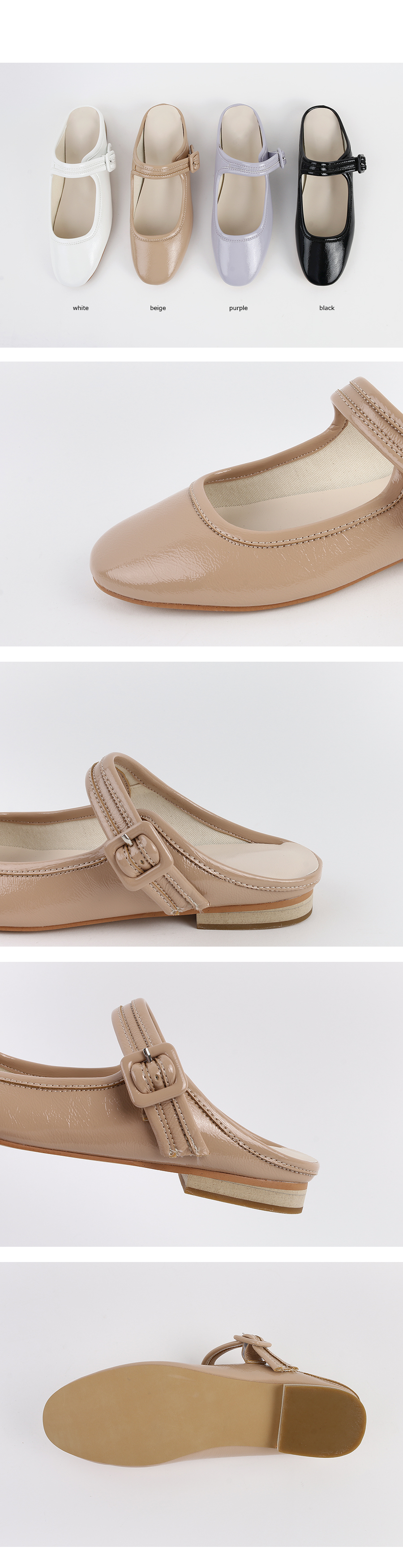 DETAILS - 소재 : 에나멜 - 컬러 : white,beige,purple,black - 피팅감 : 정사이즈 / 무게 : 보통인편 - 착화감 : 뒷꿈치쿠션으로 폭신해요 - 모델피팅 : 230