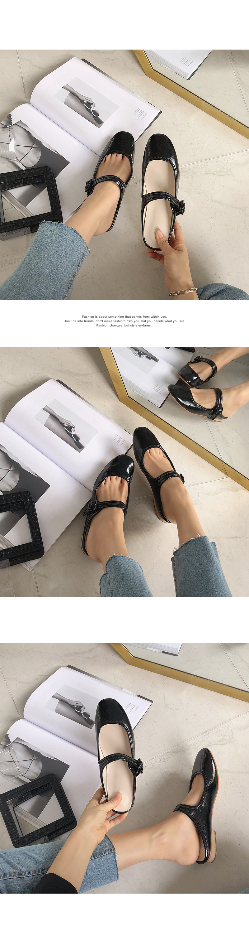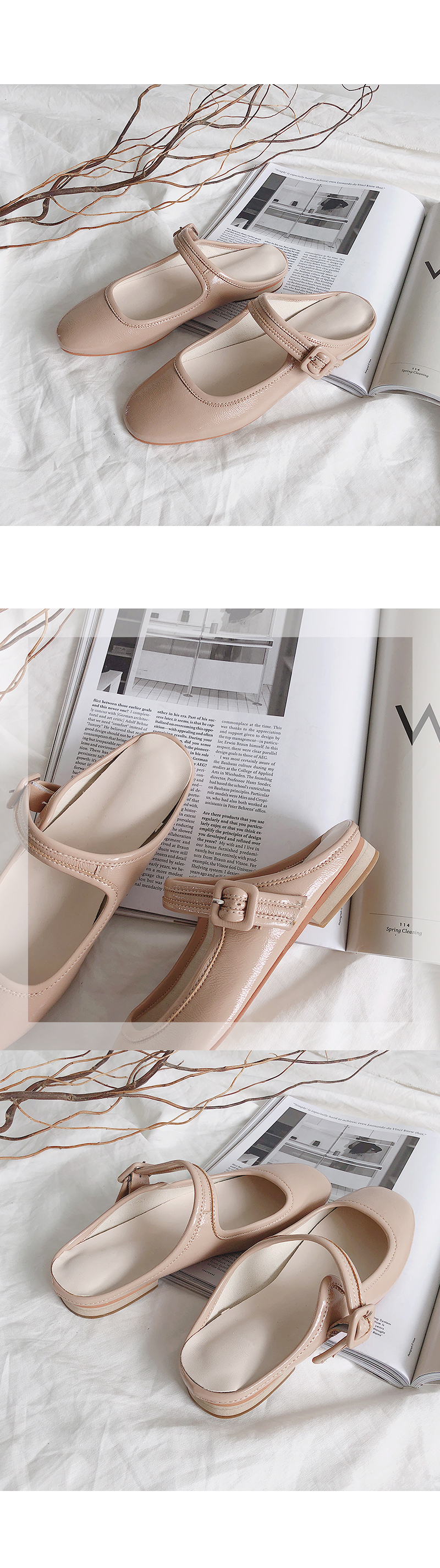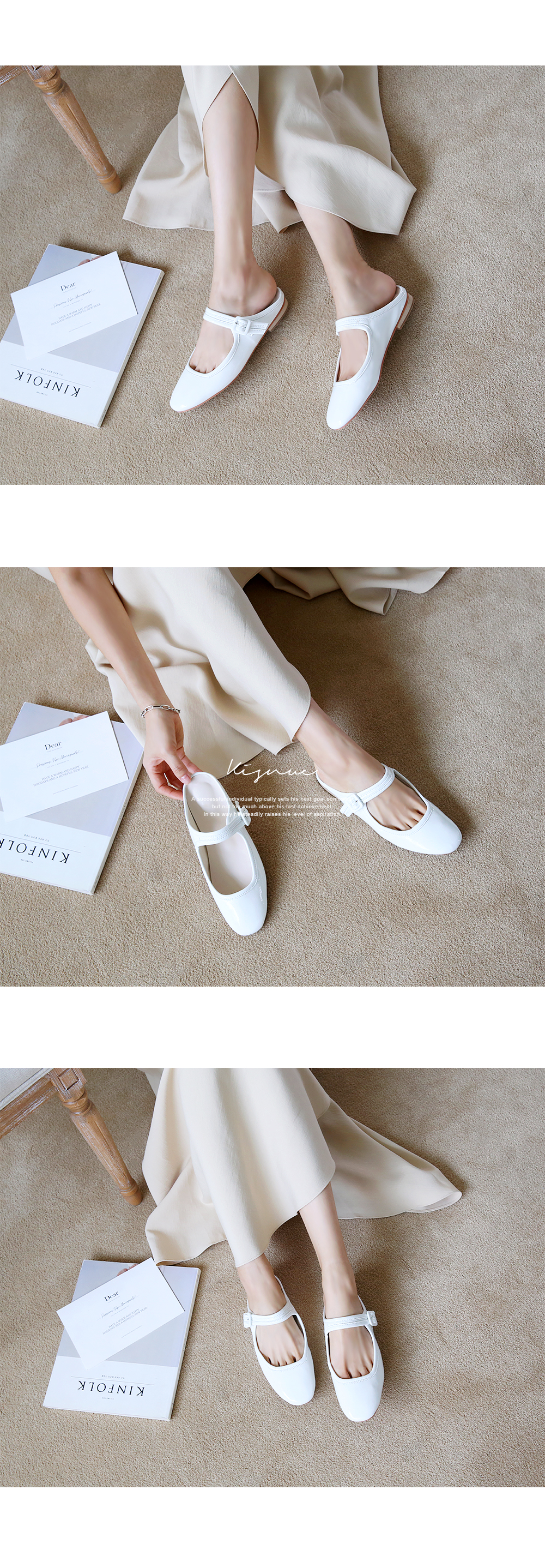 DETAILS - 소재 : 에나멜 - 컬러 : white,beige,purple,black - 피팅감 : 정사이즈 / 무게 : 보통인편 - 착화감 : 뒷꿈치쿠션으로 폭신해요 - 모델피팅 : 230