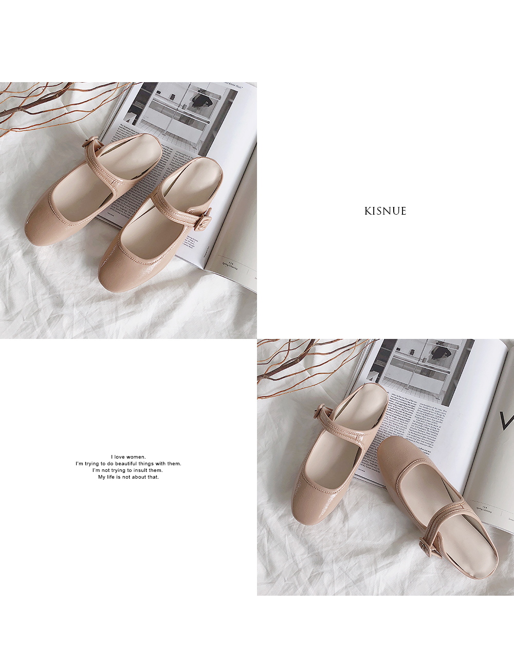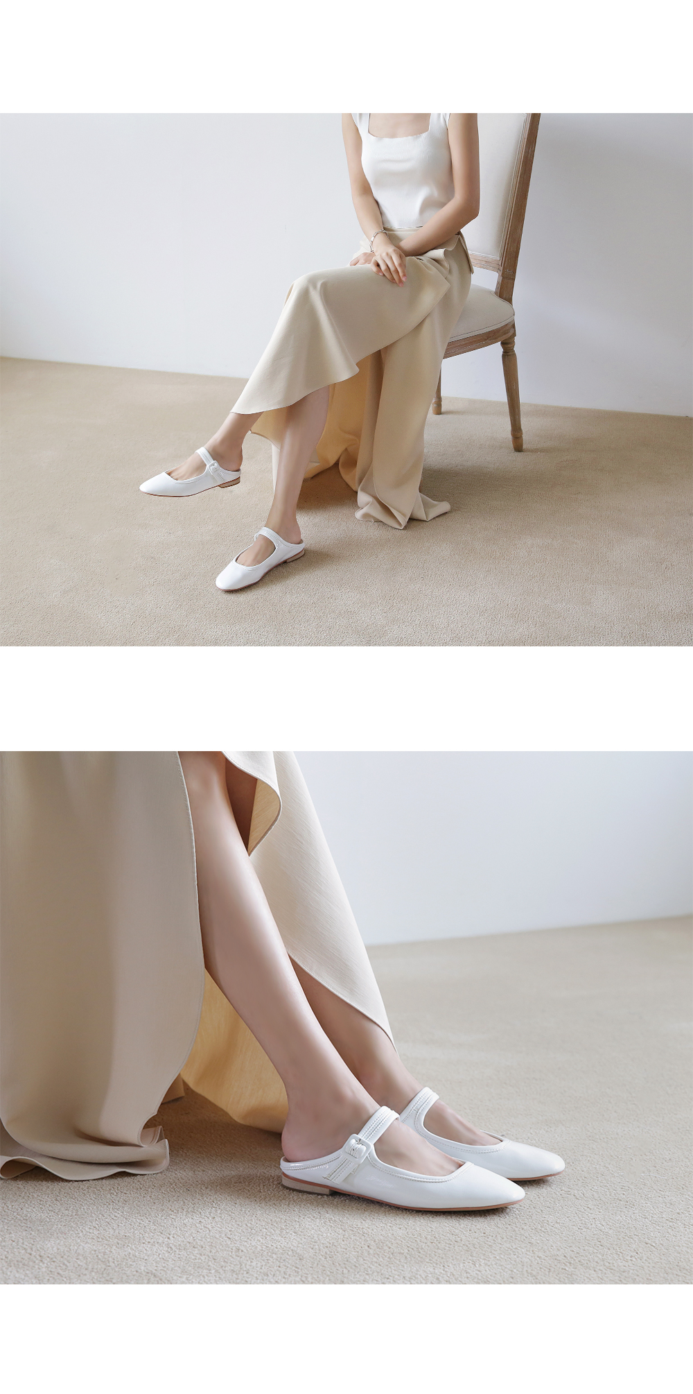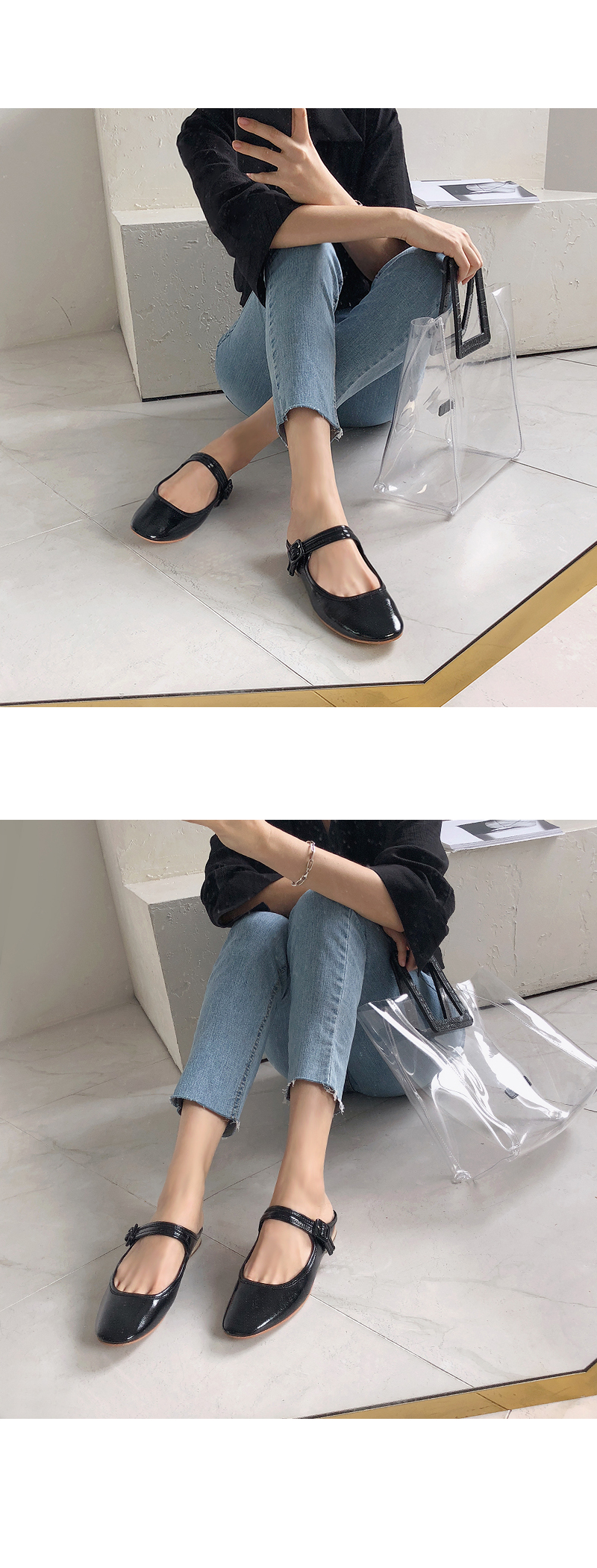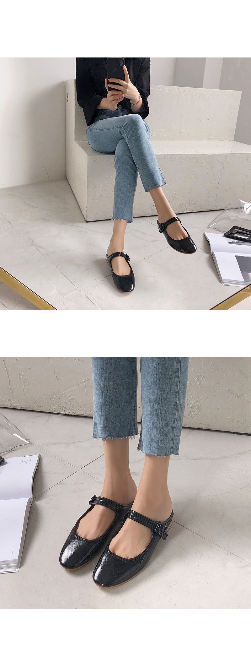 DETAILS - 소재 : 에나멜 - 컬러 : white,beige,purple,black - 피팅감 : 정사이즈 / 무게 : 보통인편 - 착화감 : 뒷꿈치쿠션으로 폭신해요 - 모델피팅 : 230