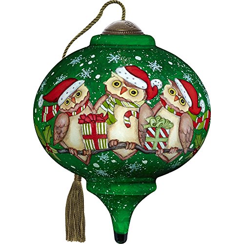 Precious Moments, Ne'Qwa Art 7171141 Hand Painted Blown Glass Petite Marquis Shaped Christmas is A Hoot With You Owls in Santa Hats Ornament, 3-inches