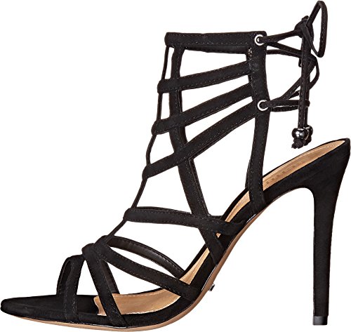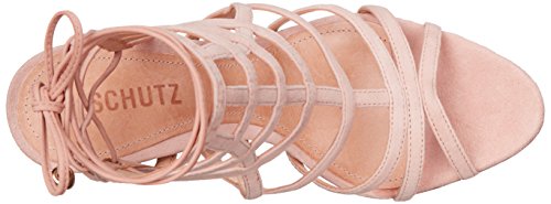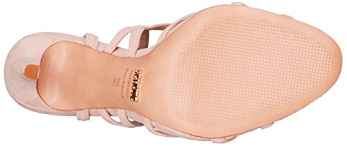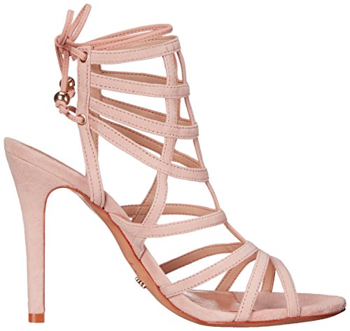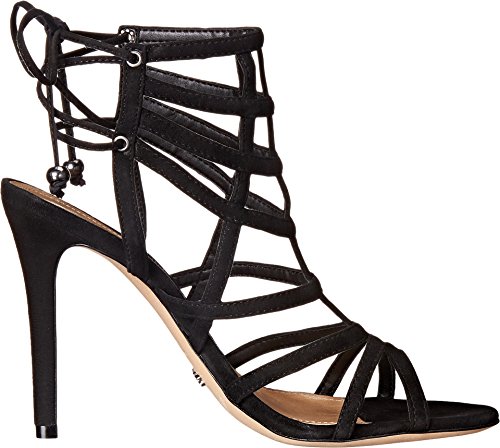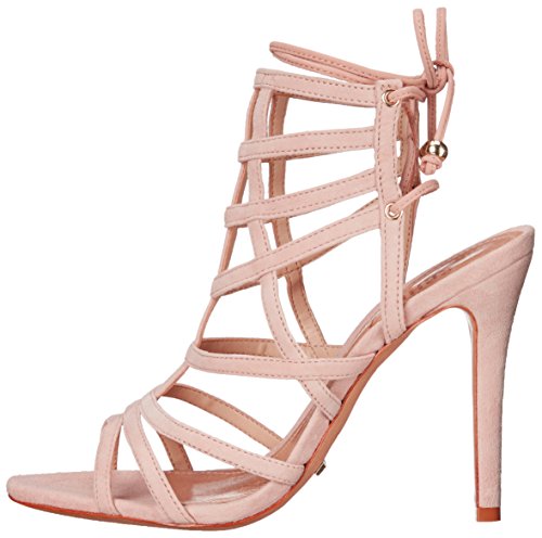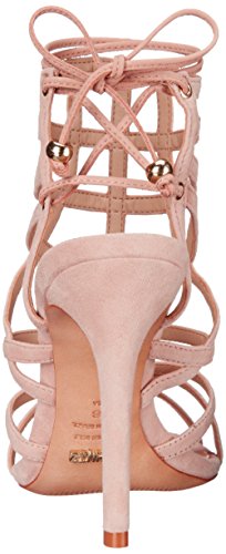 Dress sandal featuring strappy suede cage upper with slender bead-tipped laces at ankle