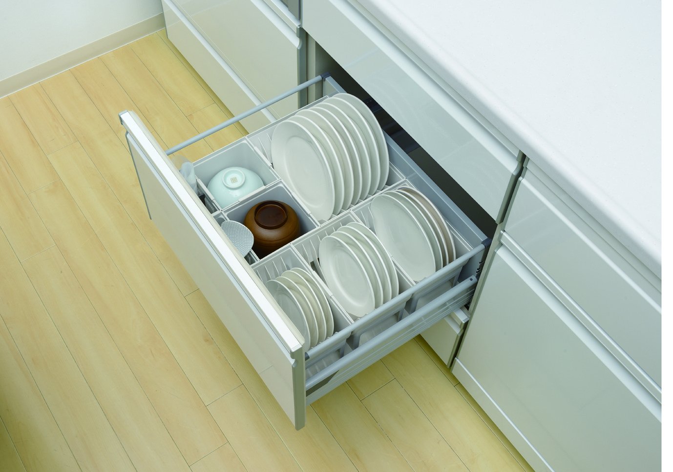 ● Pull-out system Cleanliness of the kitchen ● Store in dishes stacked and draw them inside the drawer, a special dishware case inside the drawer perfect for bowls and bowls.