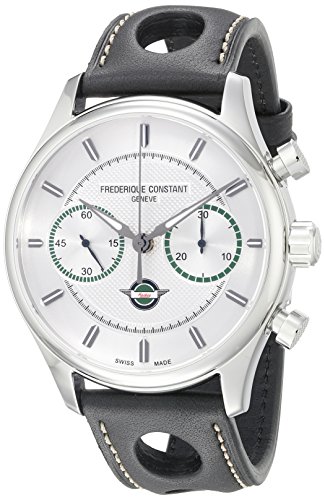 -. Feature : Polished stainless steel case (42 mm in diameter, 15 mm thick), Sapphire crystal screw-down case-back, Silver dial with guilloche center and green framed sub-dials, Black luminescent hands, Black applied indices, Healey logo displayed at the 6 o'clock position, Small seconds sub-dial at the 9 o'clock position / Chronograph function features a sweep seconds hand and 30 minute counter at the 3 o'clock position, Scratch resistant sapphire crystal, Swiss automatic movement, Caliber FC-397, Power reserve of 46 hours, Incabloc antishock system, Water resistant to 5 ATM/50 meters/165 feet, Black holed leather strap with white stitching, Pin buckle, Limited edition of 2888 pieces, Model number: FC-397HS5B6 / Swiss-automatic Movement / Case Diameter: 42mm / Water Resistant To 165 Feet