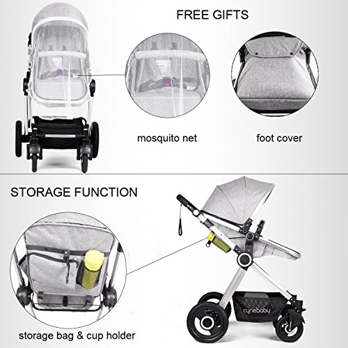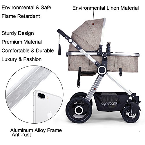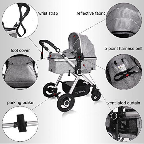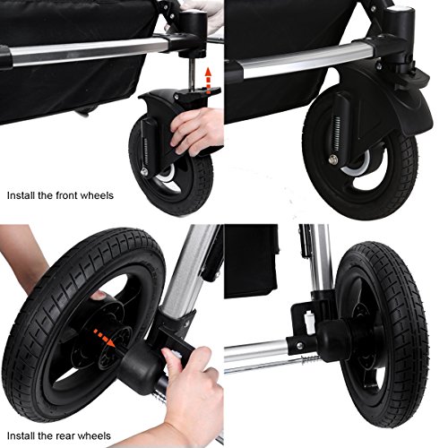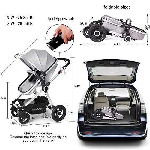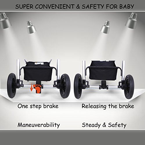 Features The high landscape pushchair with an easy to fold frame and carry strap, you can be on-the-go or stow and go with ease. The sleeping bassinet is easy to be detached. Holding down the button on both sides and then put the bassinet out. The anti-skid handlebar is adjustable. According to your height, you can adjust the handlebar to the appropriate height suitable for people who push it. The handrail is also removable. The front wheel and rear wheel are made of the rubber not plastic or EVA. Additionally, the wheel is free-inflation, and you don't need to inflate the tires. The baby stroller can be used in four seasons. Here are windproof curtains and foot cover to keep your baby warm in winter. Roll up the ventilated curtain to make the baby feel cool in summer. Additionally, three-tier weather shield can protect your baby from harmful rays. The baby stroller is sold in the US and it has instructions in English. Specifications Net weight: 25.35 lbs Gross weight: 28.66 lbs Max bearing: 50 pounds Item size: 20.1 x 12.2 x 30.7 inches Packaging size: 21.3 x 10.2 x 35.4 inches The inner width of sleeping bassinet:14.9 inches The diameter of front wheels: 7 inches The diameter of rear wheels: 12 inches Suitable for babies from 0-36 months Customer Service Promise 3 years warranty and after-sales service. Pay Attention to The canopy can be washed-hand only, avoid sun exposure. Keep away from the fire. The bassinet can't stand alone to be placed on the ground. Avoid the use of non-genuine parts or other accessories. 0 |