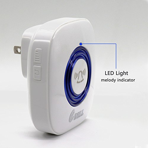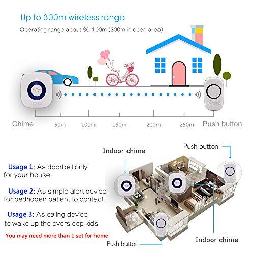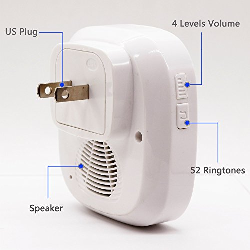 -. Feature : Wireless Doorbell Chime Kit: 1 remote button and 1 receiver with US plug, no need batteryfor receiver.Use 433MHz learning code,can add receivers as you need. / Multiple Usage: You can take it as door bell only,when someone press the button, you can hear the rings inside the house; This is also a simple alert device,for the bedridden patient,this device can help them to contact their care takers ealily; If you have kids who always sleepover, put the receiver inside his room and press the button to call him to get up. / Long Range and LED Indicator: Operating range is up to 1000ft in the open area as we test. For home use, the range is about 260ft.Both the button and receiver have LED indicator,when someone press button, the indicator will flash to remind. / 52 Melody and 4 Levels Volume: This doorbell has 52 ringtones, you can switch as you like; The music volume can be adjusted since 25-110db. / Simple Installation: For the button, you can use the tape to fix it on wall/door; For the receiver, just plug it into the socket where is convenient for you.