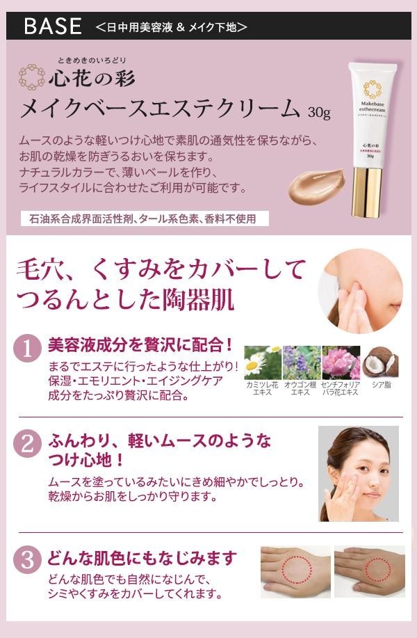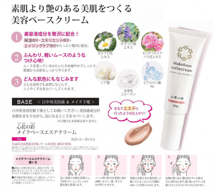 | ムースのような軽いつけ心地で素肌の通気性を保ちながら、お肌の乾燥を防ぎうるおいを保つ化粧下地です。ナチュラルカラーで、薄いベールを作り、ライフスタイルに合わせたご利用が可能です。 |