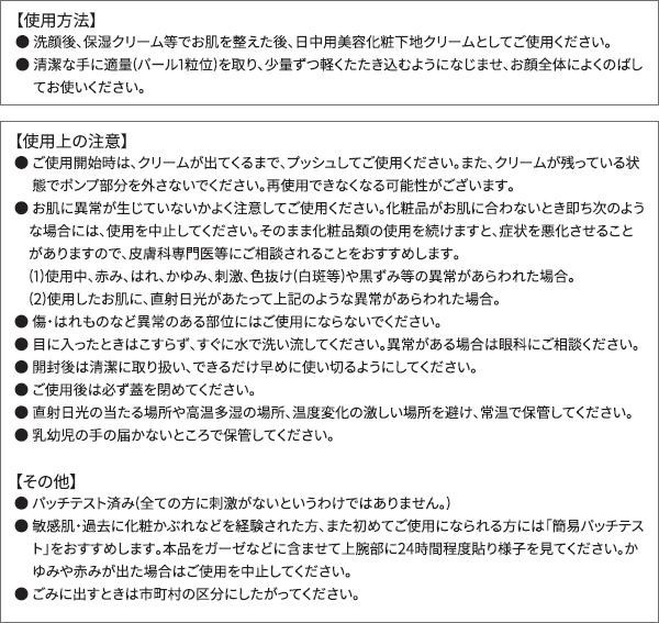 ムースのような軽いつけ心地で素肌の通気性を保ちながら、お肌の乾燥を防ぎうるおいを保つ化粧下地です。ナチュラルカラーで、薄いベールを作り、ライフスタイルに合わせたご利用が可能です。 |
