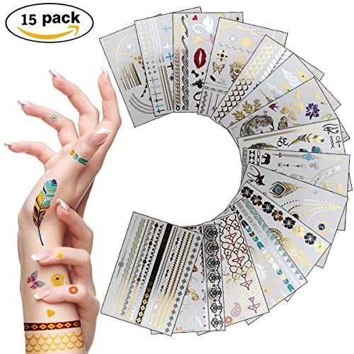 -. Title : 15 Sheet Metallic Temporary Tattoos - 300+ Shimmer Design Tattoo Gold ,Sliver and Black - Flowers, Elephants,Cross, Skull and Bracelets For Girls Kids Adult